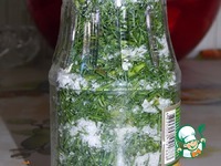 На дно баночки насыпать соль. Лучше конечно брать крупного помола. Засыпать слой укропа. |