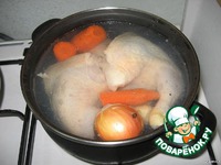Курицу отварить до готовности, добавив морковь, лук, соль, перец. |