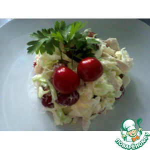 Куриное филе отварить, нарезать соломкой. Капусту нарезать полосками (можно пекинку или листья салата), черешню отделить от косточек и разделить на половинки, сыр "фета" нарезать кусками. Заправить оливковым (растительным) маслом. Солить по вкусу. Черешня должна быть очень сладкой.