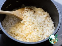 К готовому рису добавляем натертый пармезан или другой твердый сыр. Перемешиваем. |
