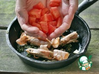 Обжарить чеснок и чили, добавить нарезанный помидор, обжаривать около 5 минут, помидор начнет немного карамелизироваться. |
