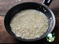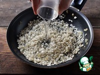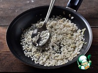 Добавить рис в сковороду к луку, тщательно перемешать, чтобы каждая зернинка была окутана маслом. |