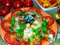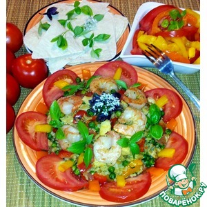 Ингредиенты - перец болгарский, помидоры, чеснок, лук, масло оливковое, зелёный горошек, курица. |