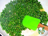 Размороженный зелёный горошек обжарить в масле и так же выложить в мультиварку. Вылить остатки куриного бульона. |