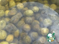 Зеленые орехи очистить от кожуры (при чистке пользуйтесь перчатками!) и замочить в холодной воде на 2 дня, меняя воду 4-5 раз в день. |