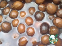 Далее на 1 сутки заливаем известковой водой - 0.7 кг гашеной извести залить 5 литрами воды, размешать, настоять 3-4 часа и процедить через марлю. Орех при этом темнеет (это норма). |