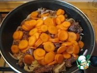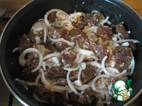 И присоединили к мясу. Здесь нужно подлить немного раст. маслица, что-бы мука не припеклась к сковороде. Слегка обжарили. |