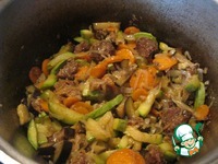 Берем казанок. Капля масла на дно, нагрелся-слегка обжарили в нем кабачки-баклажаны (не солим! Пустят сок-все расползется). Сюда-же мясо, |