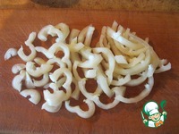 Лучек-полукольцами разбираем на отдельные перышки. Присолили, присыпали щепоткой сахарку, притрусили мукичкой |