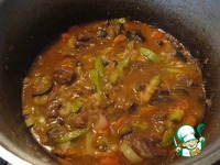 Нарезанную небольшими кусочками телятину обжарить до румяности, влить немного водички и тушить до мягкой кондиции под крышкой в глубокой сковороде, подливая воду при необходимости. |