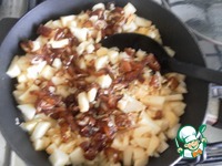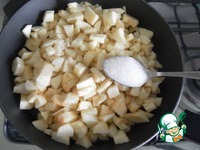 Для начала яблоки очищаем от кожуры, режем кубиками. Складываем их в сковороду, посыпаем 1 ст. л. сахара, ставим на огонь и тушим минут десять, пока яблоки не станут мягкими. |