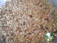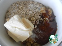 Выкладываем для удобства содержимое сковороды в кастрюлю или другую емкость, добавляем другие ингредиенты: овсяные хлопья, сахар, мед, сливочное масло, корицу. Все хорошо перемешиваем. |
