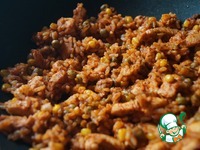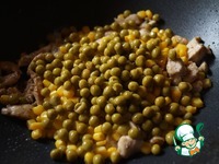 Добавляем горошек и кукурузу. Обжариваем, постоянно мешая секунд 30. |