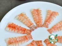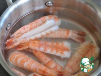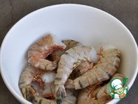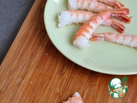 Отварить креветки в кипящей воде 2 минуты. Вынуть шпажку, очистить от панциря, хвост оставить. Отрезать выступающий кусочек мяса внизу. |