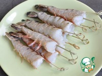 Под панцирь аккуратно засунуть деревянную шпажку чтобы креветка не скрутилась во время варки. |