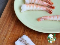 Смачивая нож в воде после каждого надреза, разрезаем роллы на одинаковые порции. Креветки нарезаем шириной с ролл. Выкладываем нарезанных креветок на рисовый ролл. |
