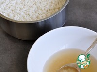 Пока рис доходит, приготовить заправку для риса. Смешать уксус, сахар и соль. Поставить на 20 сек в микроволновку чтобы сахар и соль растворились. Хорошо перемешать. |