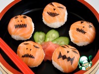 Из нори вырезать злые рожицы и украсить ими шарики. Halloween Salmon Temari Sushi - для детей готовы. |
