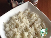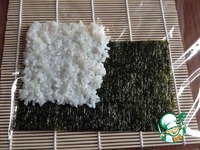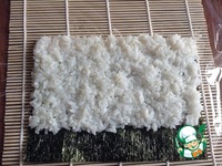 Вот лист нори с рисом перевернули. Пленку с верха сняли. |