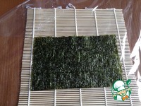 Затем следует накрыть нори с рисом второй половиной коврика и перевернуть все вместе, слегка прижимая ладонью. Разверните коврик. Рис должен оказаться внизу, а нори - сверху. |