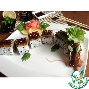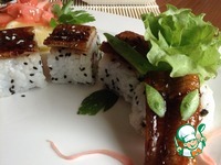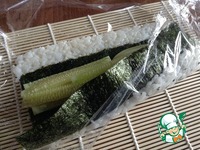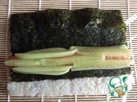 Далее производятся те же действия, что и при скручивании любых других маки-суши: положите на середину нори выбранную вами начинку, |