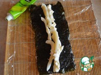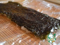 Аккуратно снимаем лист нори с коврика, коврик сбрызгиваем смесью воды с уксусом. И переворачиваем лист нори на коврик рисом вниз. У нас будет ролл наизнанку. |