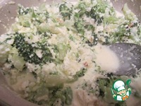 Получившуюся массу аккуратно смешаем с брокколи и луком. |