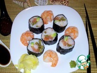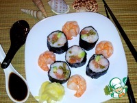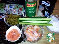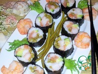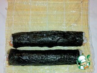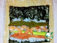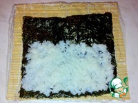 Ингредиенты я подготовила для двух рулетов. Промытый рис сварила в подсоленной воде так, чтобы он был немного не доварен. ( Варила 15 минут, потом оставила под крышкой попреть ). Приготовила заправку для риса - вода, уксус и сахар. Заправку вылила в рис и перемешала его. Сразу всю заправку не выливайте, чтобы не оказалось её много... Нори пополам не разрезала, а использовала целые листы. Циновку завернула в целофан, так с неё удобное убирать лишние остатки. Положила лист нори на циновку и выложила половину ( тёплого ) риса. |