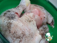 Сначала надо замариновать цыплят. Куриное мясо хорошо посолить, поперчить, насыпать петрушки, добавить гранатовый соус, 5 ст. л. растительного масла, перемешать и оставить на 1 час для маринования. |