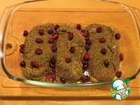 Жаростойкую посуду смазываем подсолнечным маслом и укладываем натёртые приправами грудки, присыпаем сушёной клюквой. |