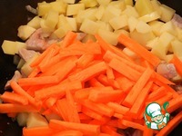 Добавляем к мясу картофель с морковкой и жарим еще 4-5 минут |