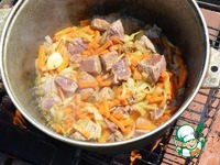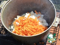 На дно казана вылить растительное масло, разогреть, выложить морковь и лук, обжарить, до прозрачности лука. |