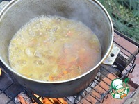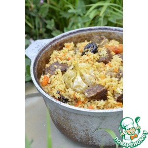 Когда рис начнет увеличиваться вдавить в него головки чеснока. И продолжаем готовить рис практически на углях, так как самый жар был в самом начале, при варке мяса. Готовим с закрытой крышкой. |