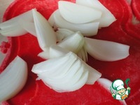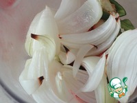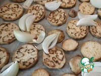 Выкладываем между баклажанами лук. Тоже смазываем маслом. Всего на этот процесс уйдет около 1,5 ст. л. масла. |
