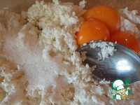 Пока меренга остывает готовим крем. К творогу добавляем желтки, 1 ст. л. сахара (больше не надо, т. к. меренга достаточно сладкая) и 1 пакетик ванильного сахара. |