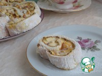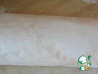 С помощью нижнего пергамента сворачиваем наш десерт рулетом. Слегка покатать рулет по столу, но не сильно придавливать. |