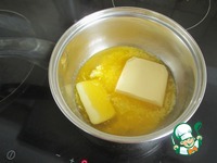 Данное количество ингредиентов рассчитано на форму диаметром 20 см. Первым делом растопить сливочное масло (120 гр) на маленьком огне. И оставить его немного остыть. |