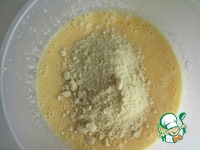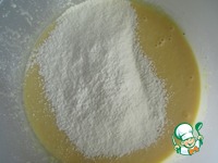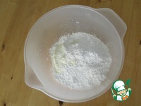 Муку (220 гр) смешать с пачкой разрыхлителя. Просеять и в три приема вмешать в тесто. |