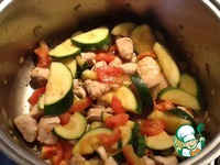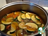 Далее добавляем цукини, перемешиваем все, сбавляем огонь до среднего и тушим все минут 5. |