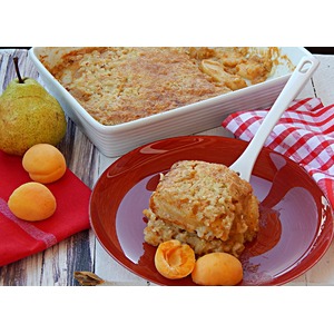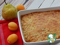 Затем выкладываем груши, на груши абрикосовое пюре. Сверху оставшуюся рисовую смесь. |