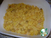 Хлопья высыпать в форму (вместо коржа). Желатин замочить для набухания в воде (небольшое количество). |