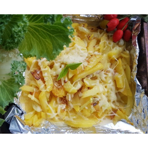 Очищенный и нарезанный соломкой или кусочками картофель тушить в небольшом количестве воды и масла. Обжарить мелко нарезанный репчатый лук, до золотистого цвета. Зелень мелко порезать и вместе с обжаренным луком вмешать в картофель, посолить. Готовую массу выложить в смазанную маслом сковороду полить смесью из яиц с молоком и запечь в духовке. Подавать к блюдам из рыбы и птицы.