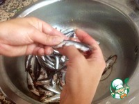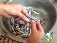 Процесс чистки очень простой. Опишу подробно для тех, кто никогда раньше не чистил рыбу таким способом. Взять кильку около основания головы |