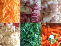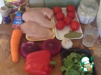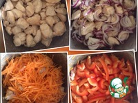 Морковь натираем на крупной терке. Лук нарезаем четверть кольцами. Курицу режем небольшими кусочками. Зелень мелко рубим. Перец нарезаем брусочками. Чеснок выдавливаем через чесночницу. |