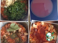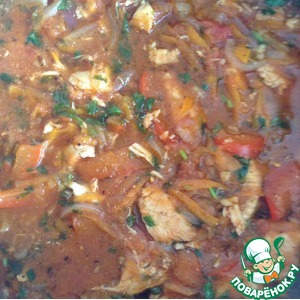 В козанке или в сотейнике обжариваем курицу до появления золотистой корочки (15-20 мин.) Добавляем лук, обжариваем ~7мин. Добавляем морковь, перемешиваем. Добавляем перец, перемешиваем. |