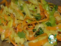 Огурец также овошечисткой нарезать на полоски и добавить к овощам. Хорошо перемешать и оставить на несколько минут настояться. |