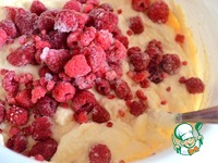 В готовое тесто кладем горсти две малины. У меня малина этого сезона уже заморожена и всегда под рукой. Смазываем форму, выкладываем тесто. |