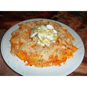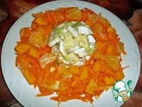 На середину тарелки выложить горкой авокадо с яйцом, а вкруговую – морковь с фруктами. Зарпавить морковь соусом из растительного масла, сока лимона (или уксуса), сахара и молотого арахиса. |