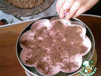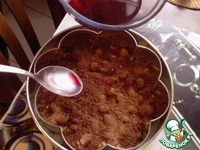 Выкладываем слой вишни, щедро посыпаем тертым шоколадом (100 гр) и остатками вина поливаем сухие края печений. Остальную вишню смалываем в пюре в блендере (понадобится 300 мл пюре). |