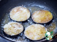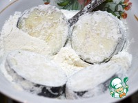 Муку смешать с 1 ч. л. соли. Обвалять кружки баклажана в мучной смеси. |
